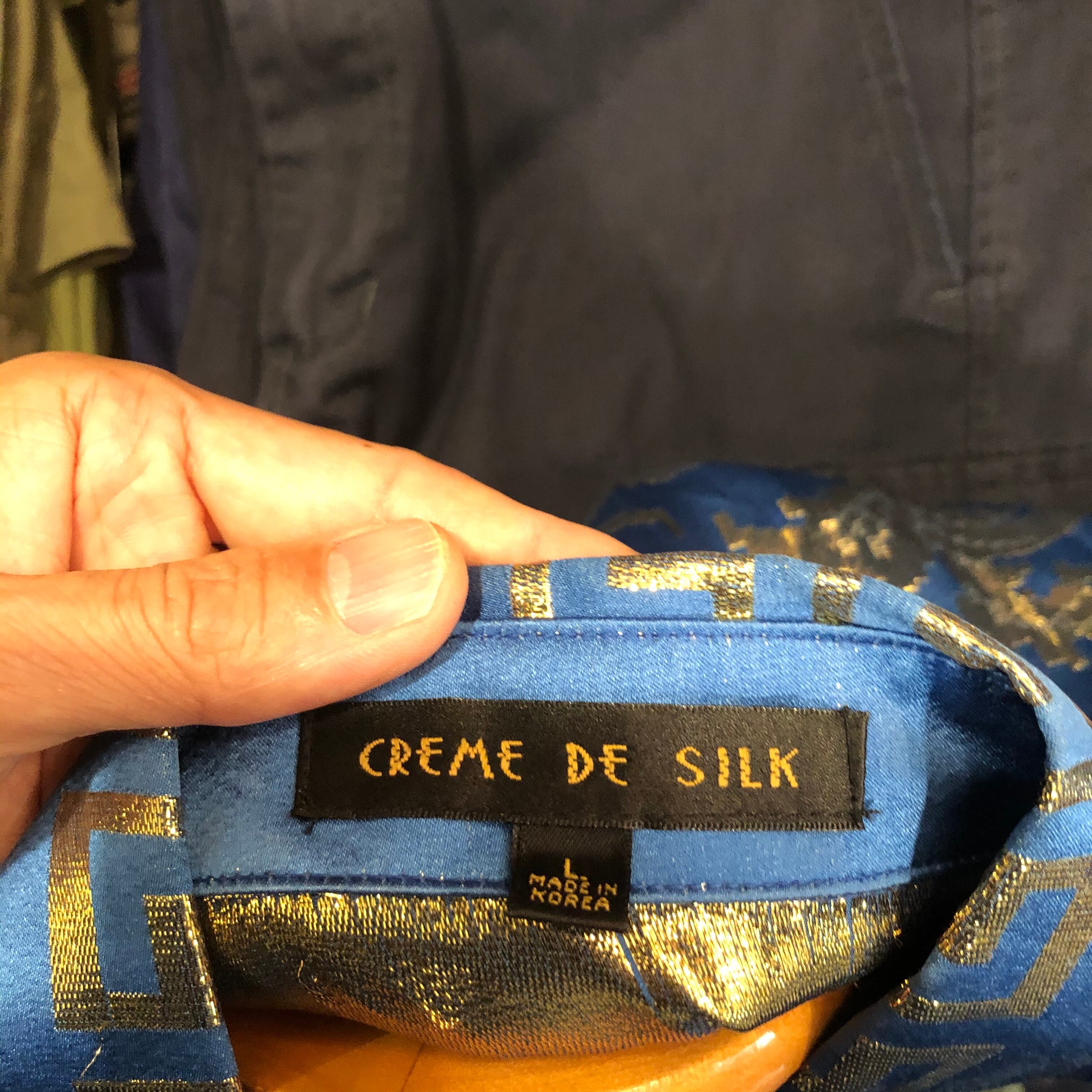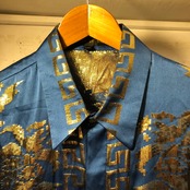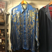 ゴールドとセルリアンブルーのゴージャスなシルクシャツ。