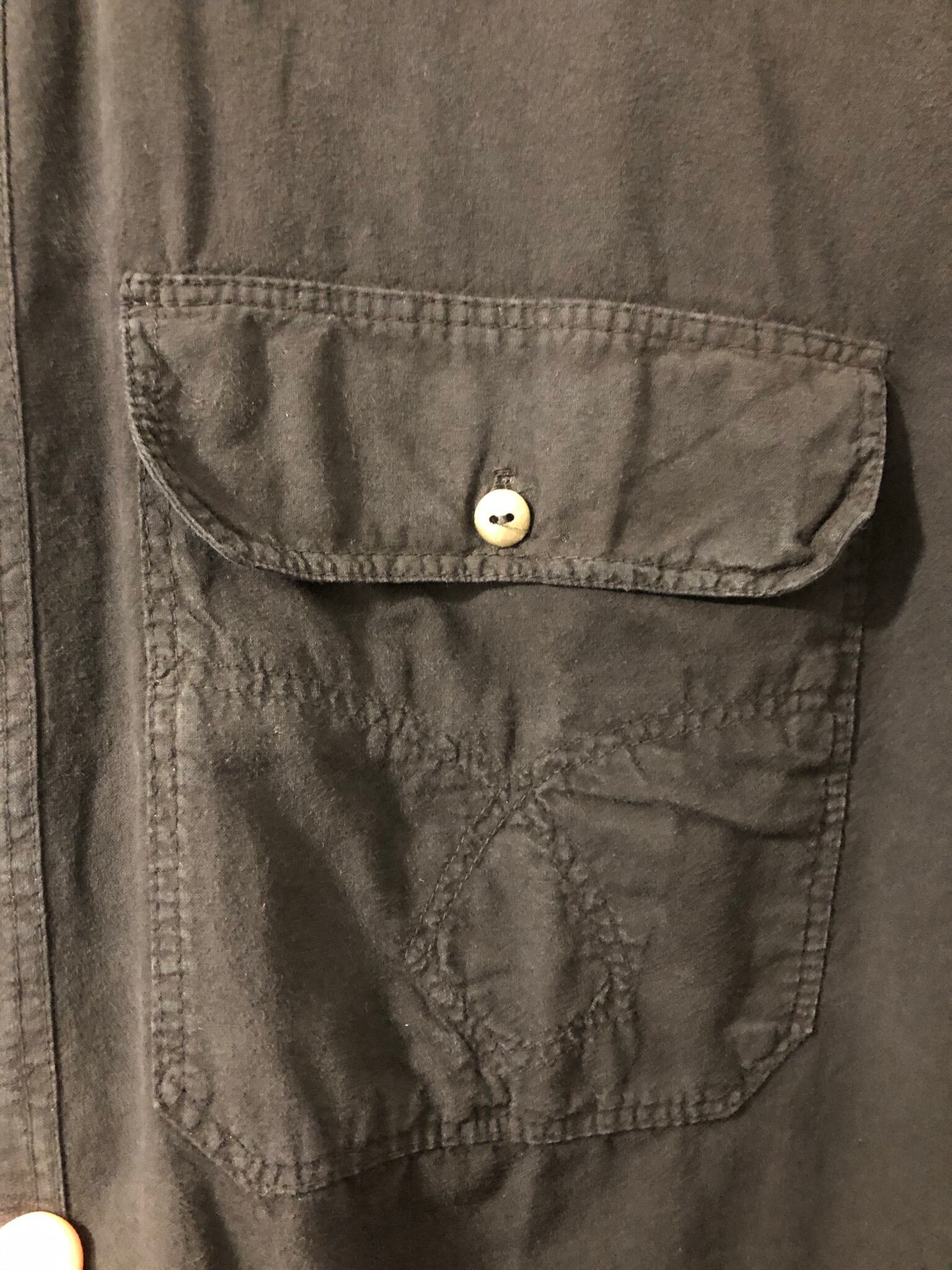 真鍮製か銅製のメタルボタンには、緑青がついていて、デッドストックですが、80年代ぐらいのシャツのため、経年による変化で自然発生したものだと思います。