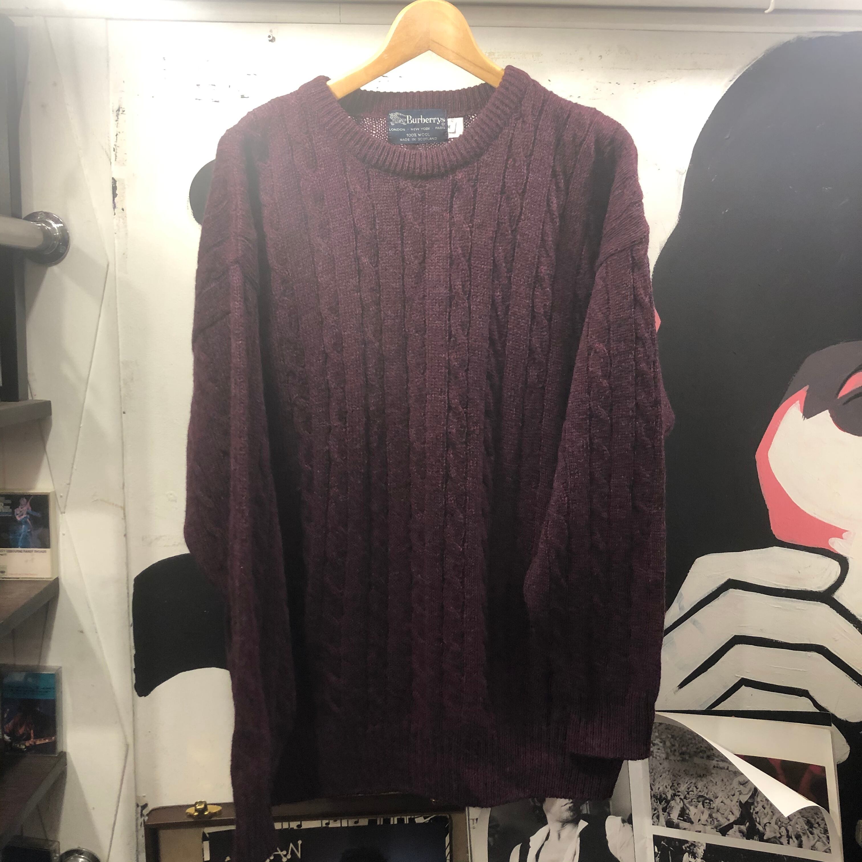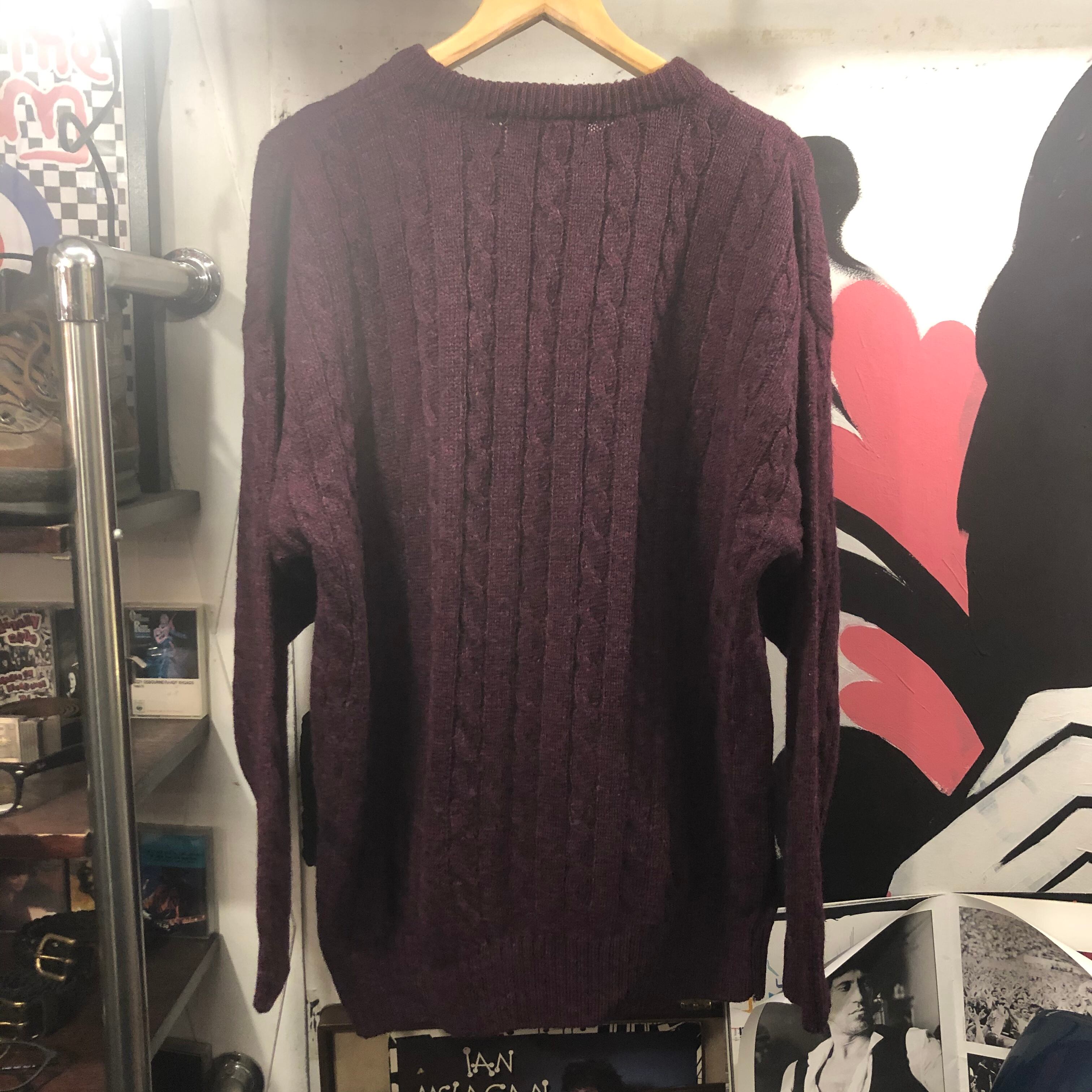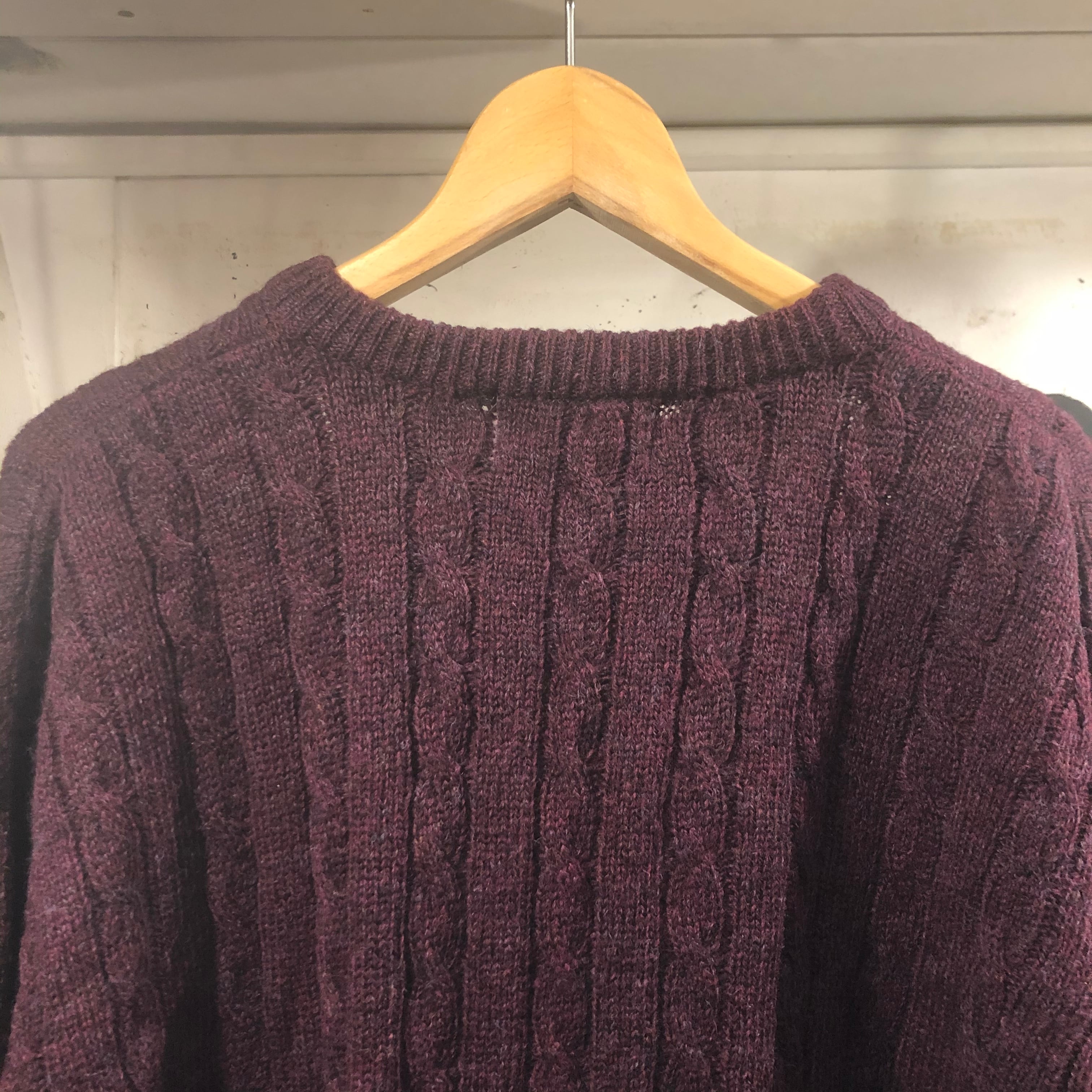 ボルドーカラーと紫の中間色のザックリした生地感のアランニット。秋らしい深みのある色味
