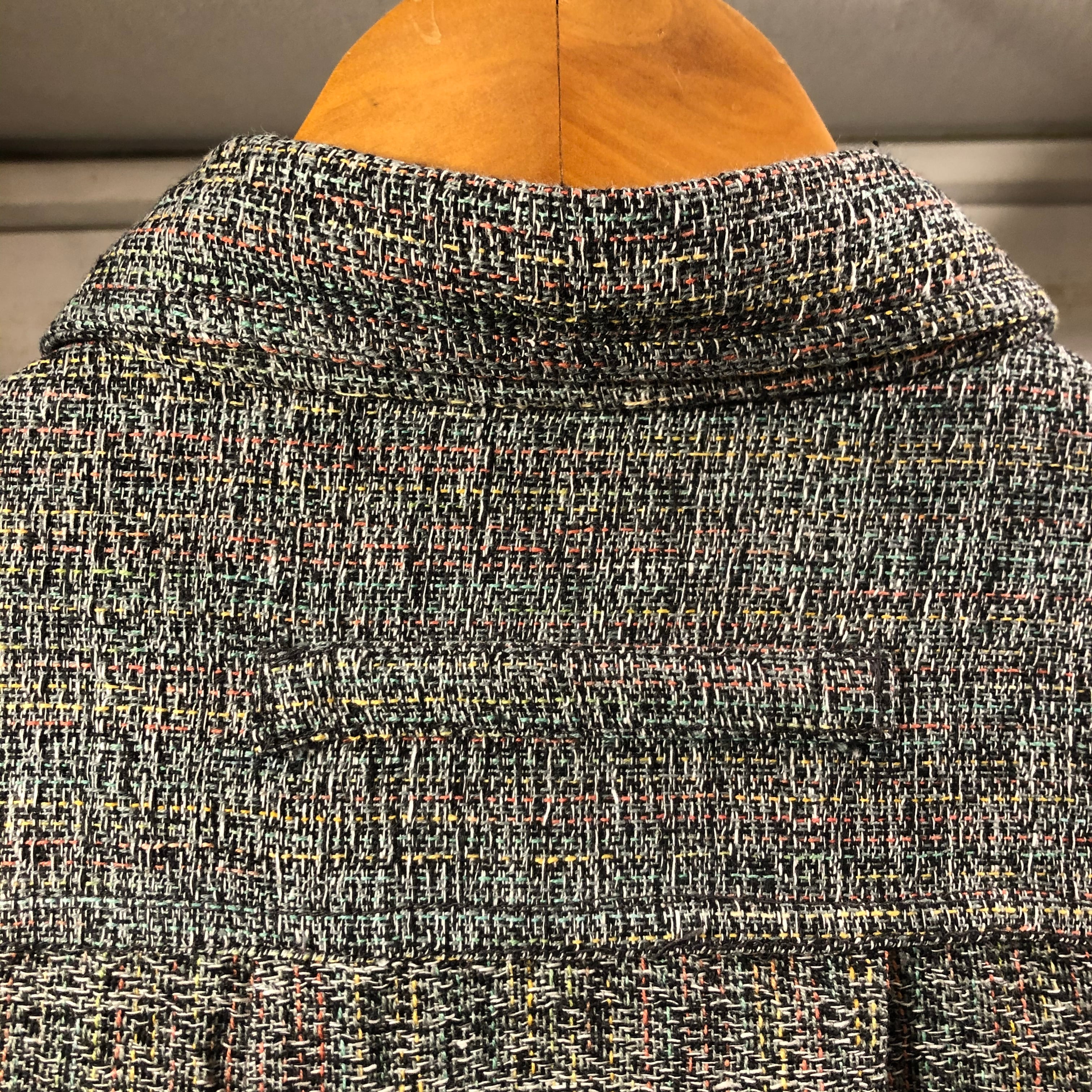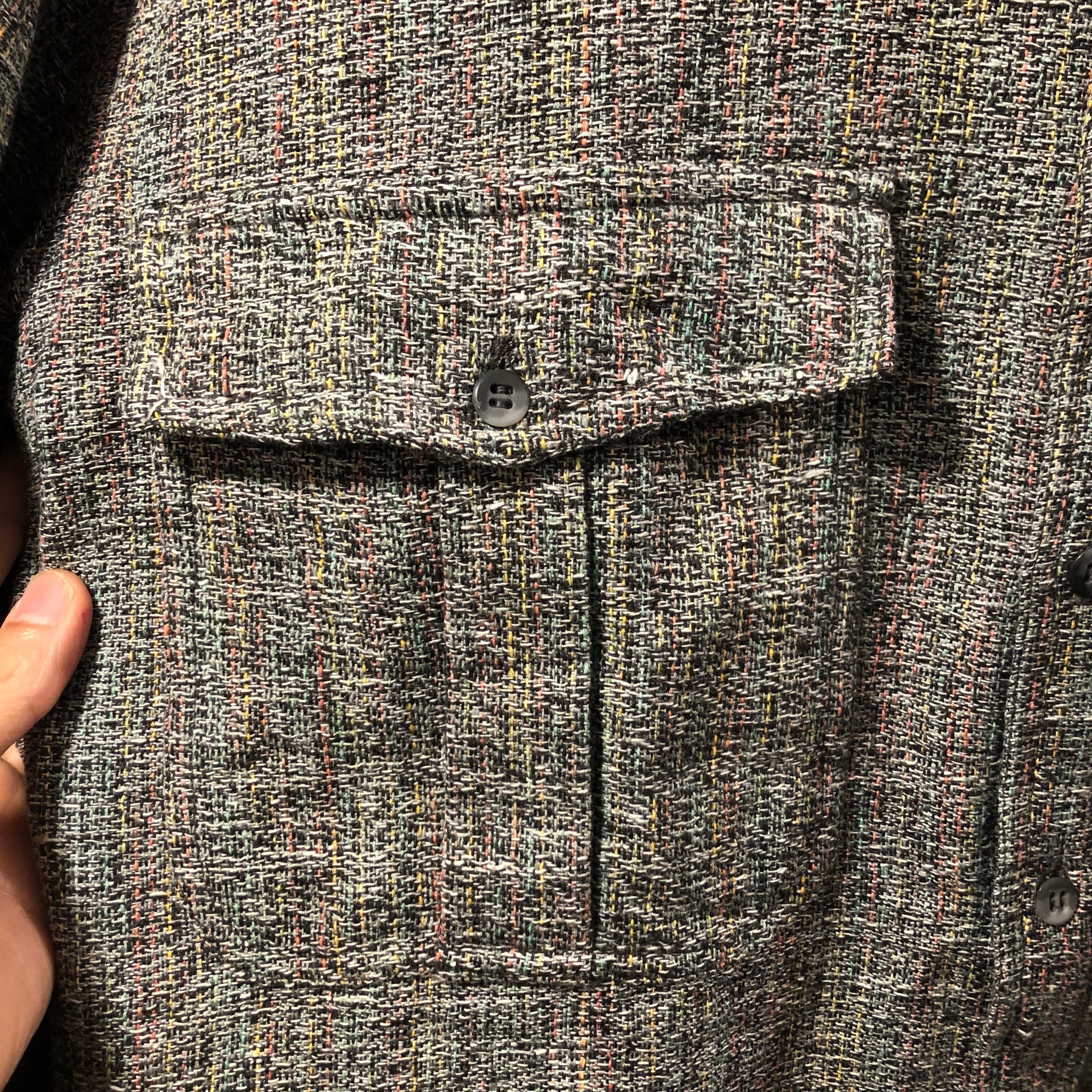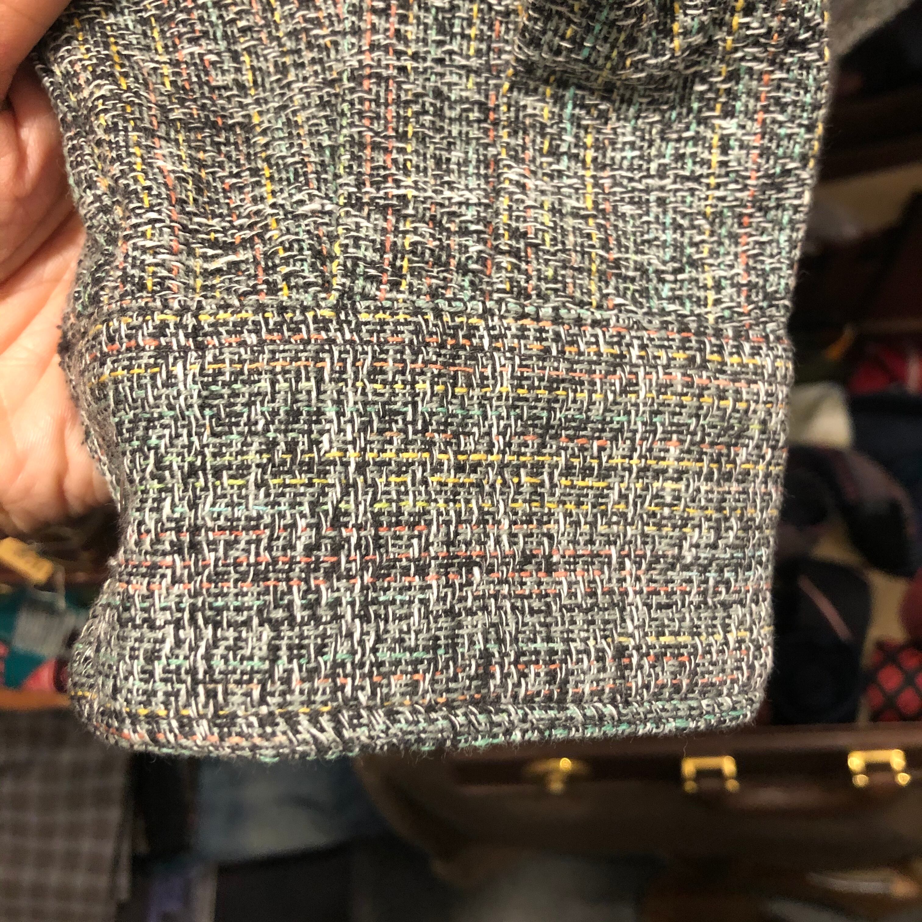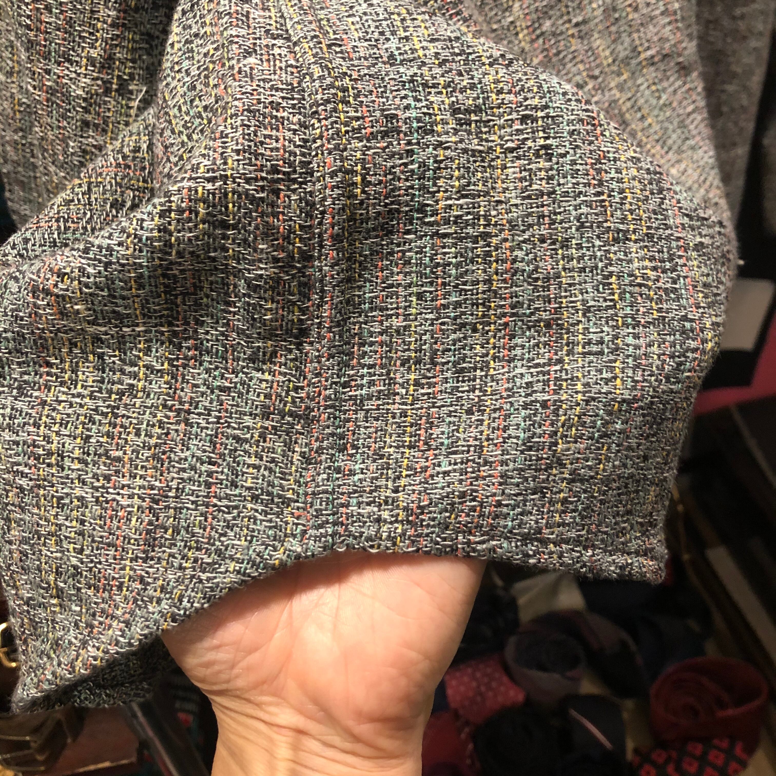 遠目から見たらグレーっぽい色味ですが、白、黄色、オレンジ、ピンク、黒、緑色の太めの糸をザックリと粗めに編み込んだ唯一無二の生地です。