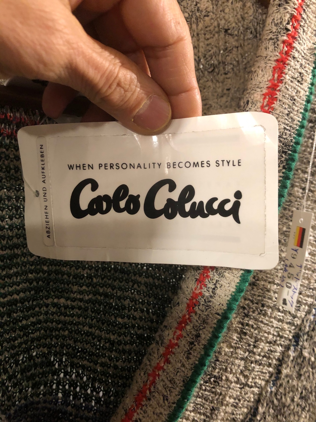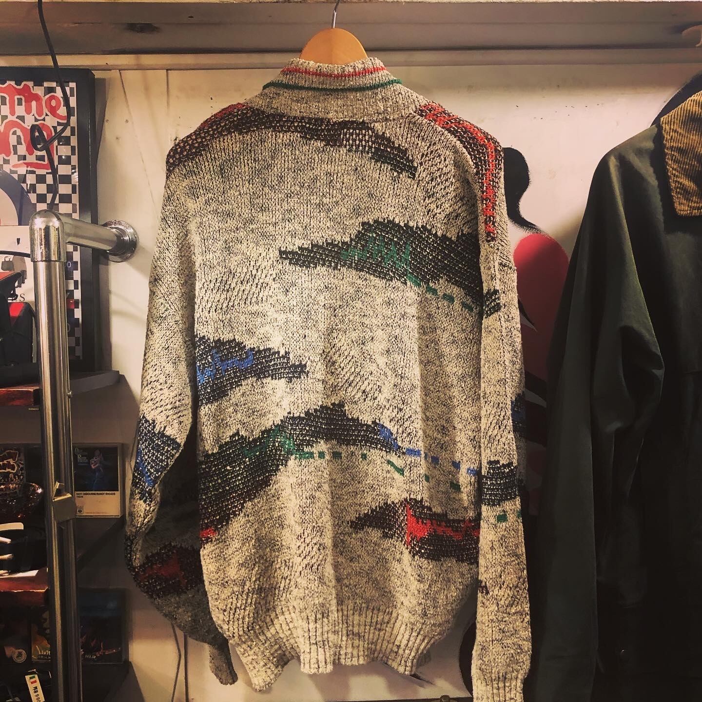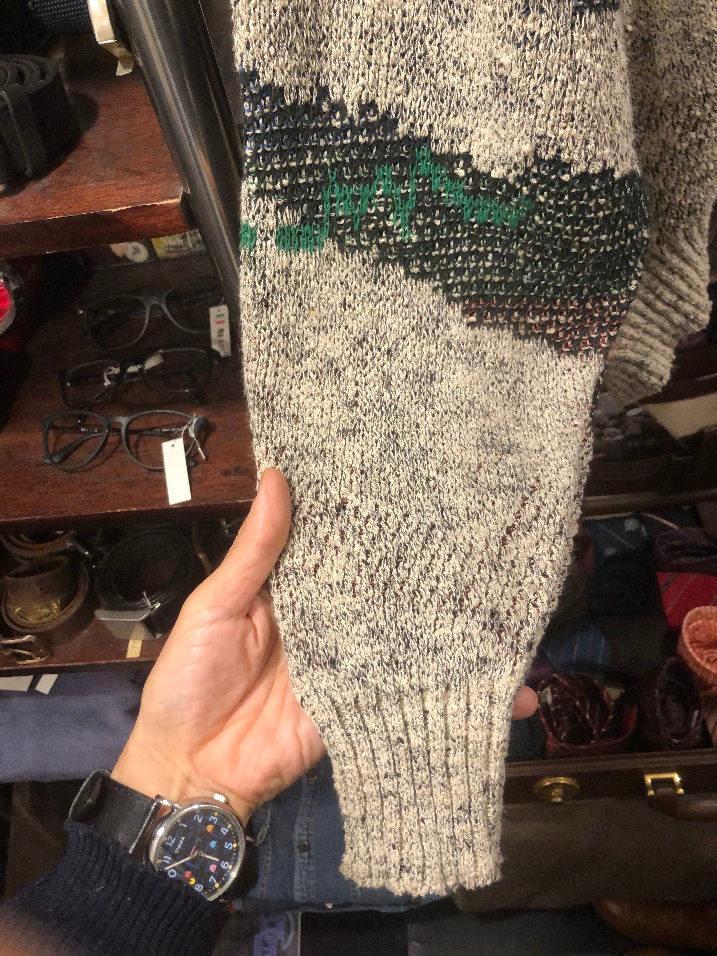 黒、グレージュ、緑、青、赤の糸を複雑にざっくりと編み込まれた伸縮性のあるローゲージニットです。