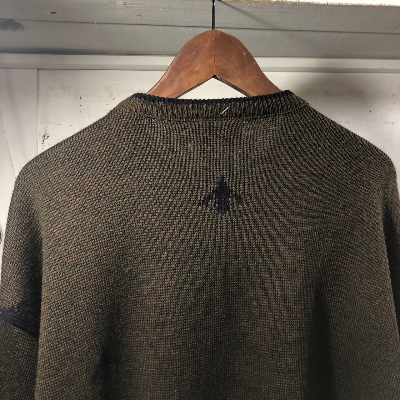 ニットのボディーに点在する紋章のようなマークと首のリブは、濃いめの紫色です。