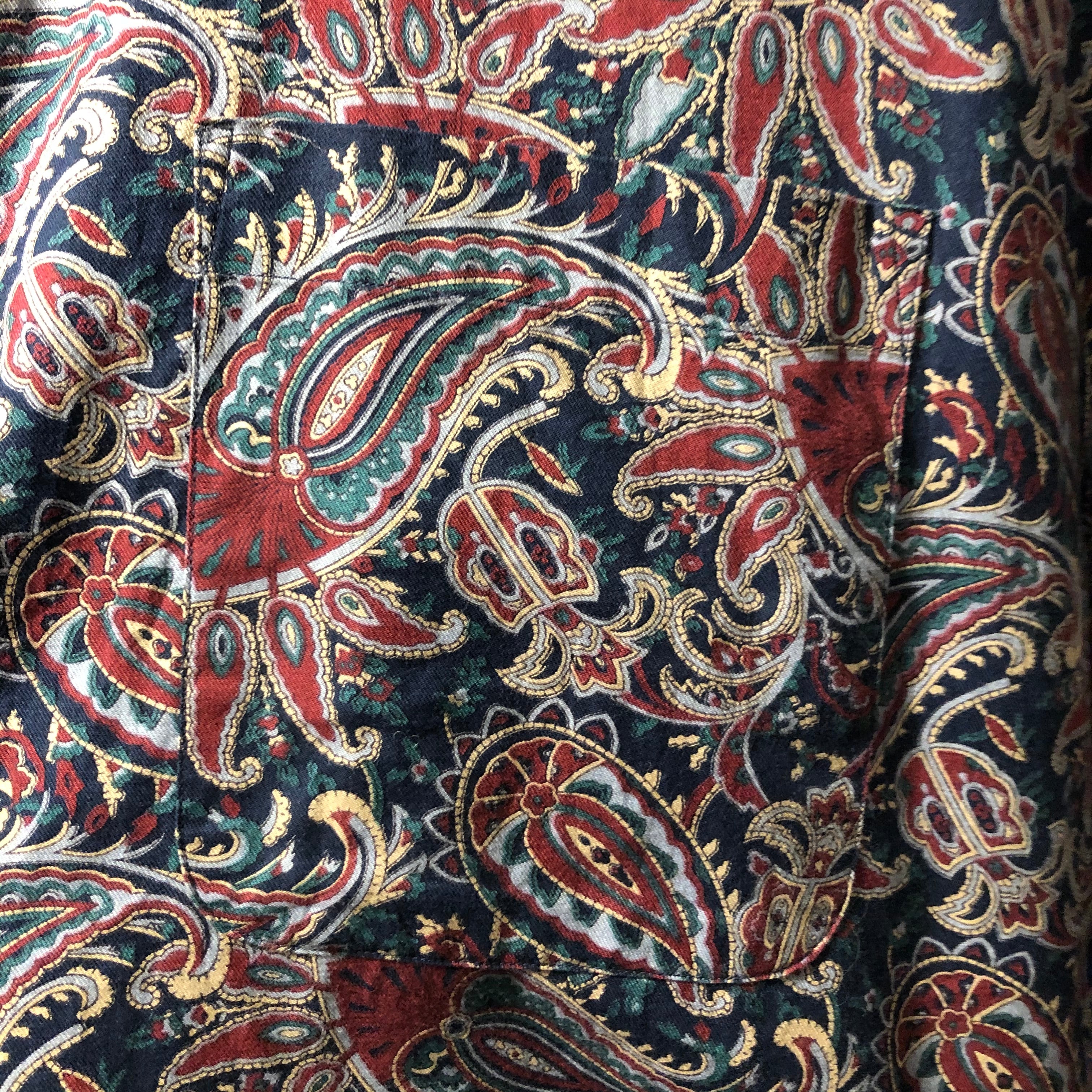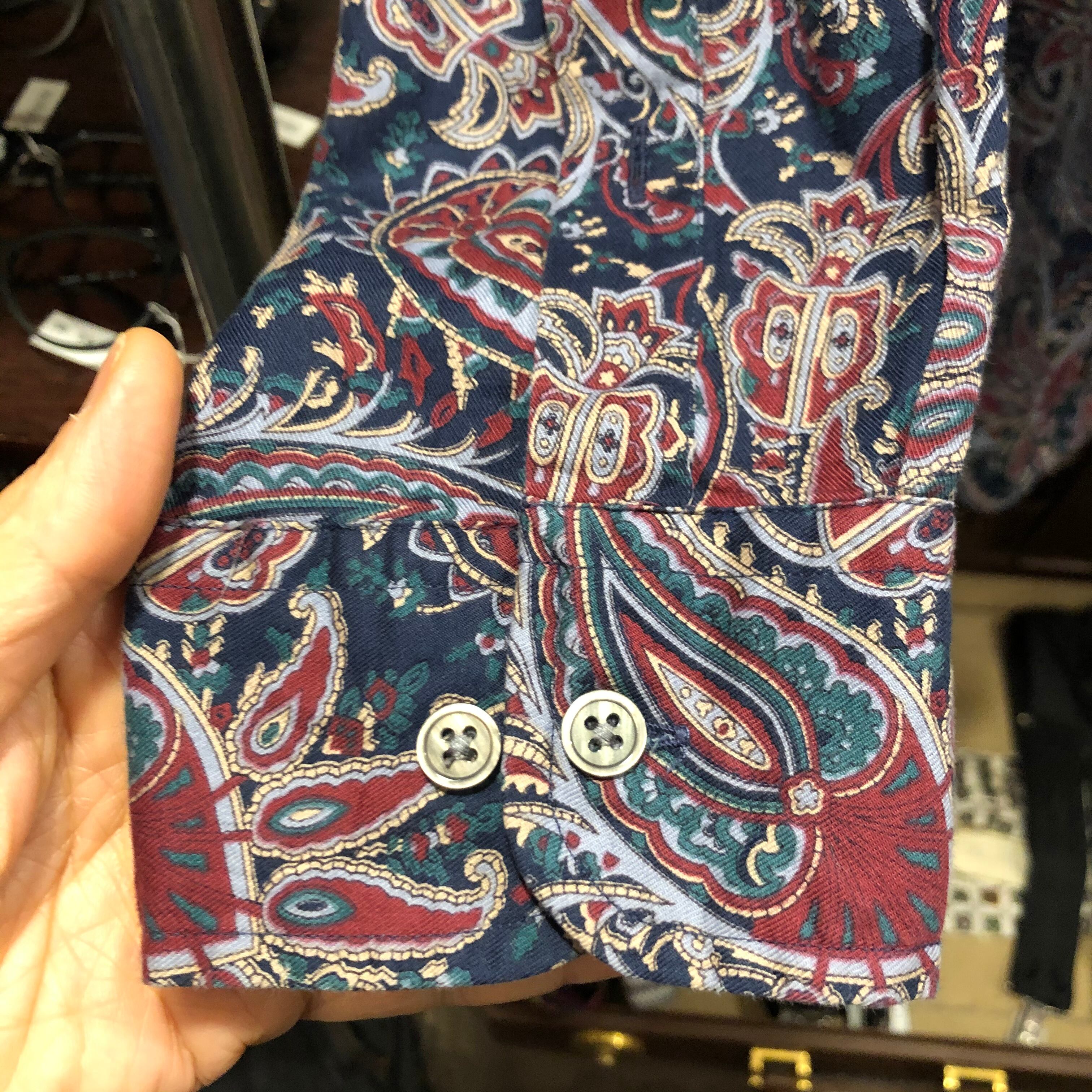 コットン100%のペイズリー柄シャツです。ネイビーをボディーにえんじ色をメインにしたペイズリー柄です。クッキリとした美しいペイズリー柄です。