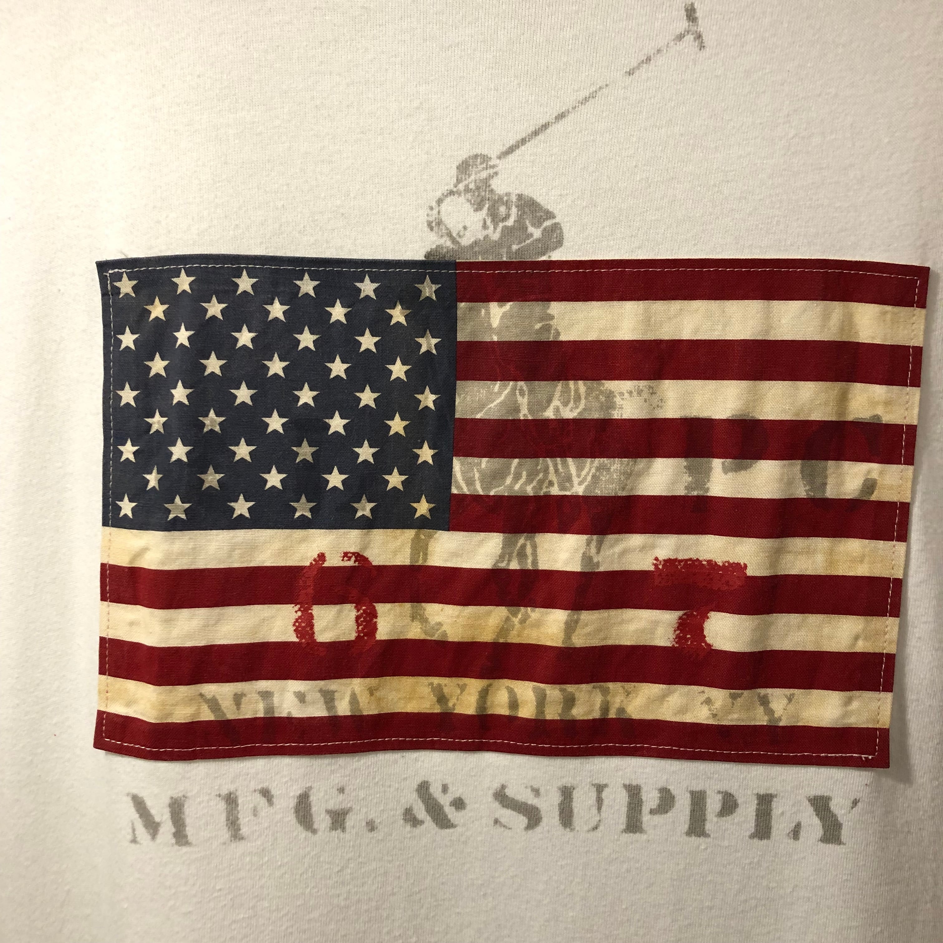 その星条旗の上に、ラルフローレンのポロのロゴがプリントされていて、かつ星条旗の下のほうが、土で汚れたような加工がほどこしてあります。意外と凝った面白いデザインです。