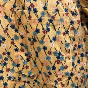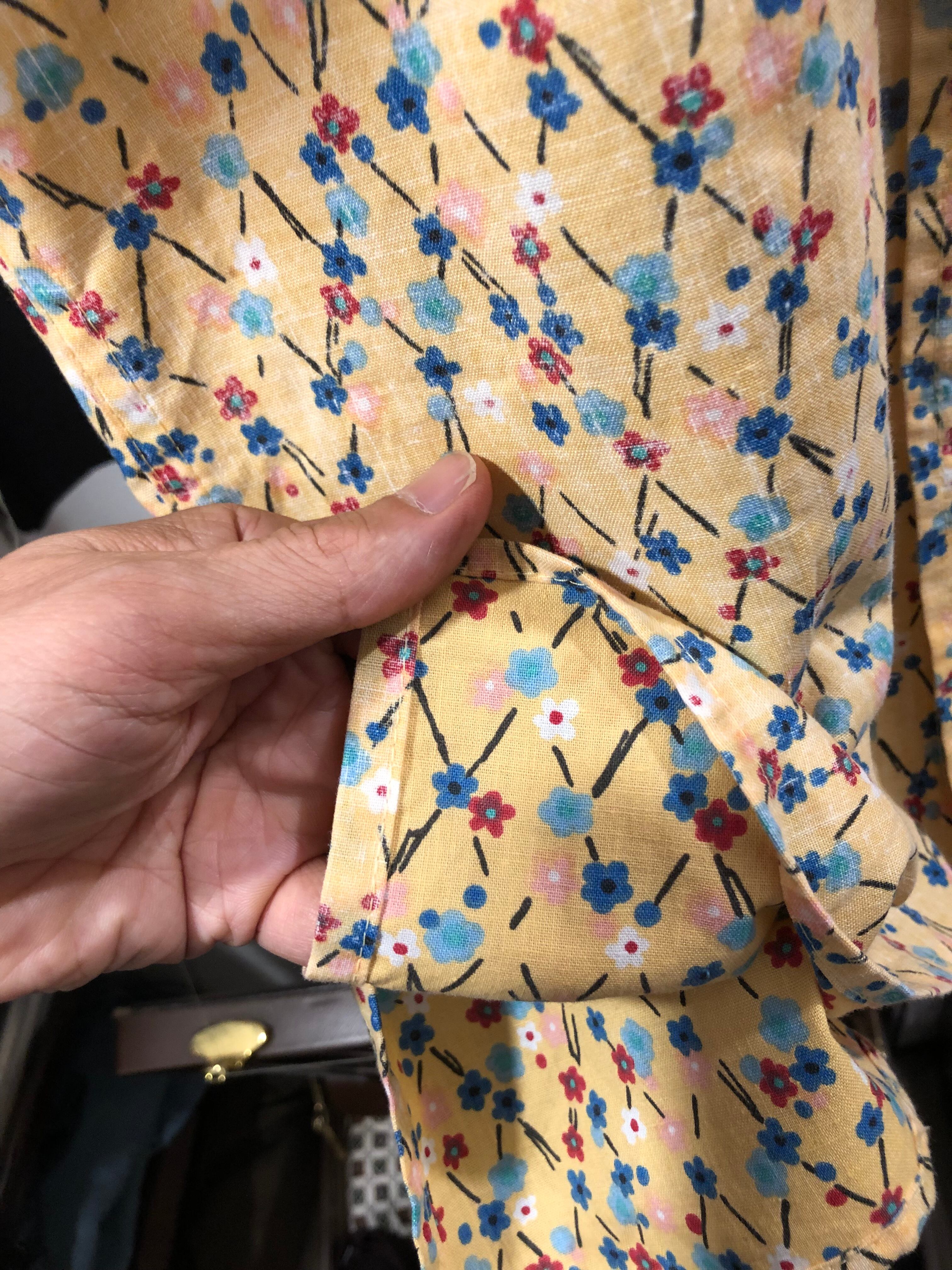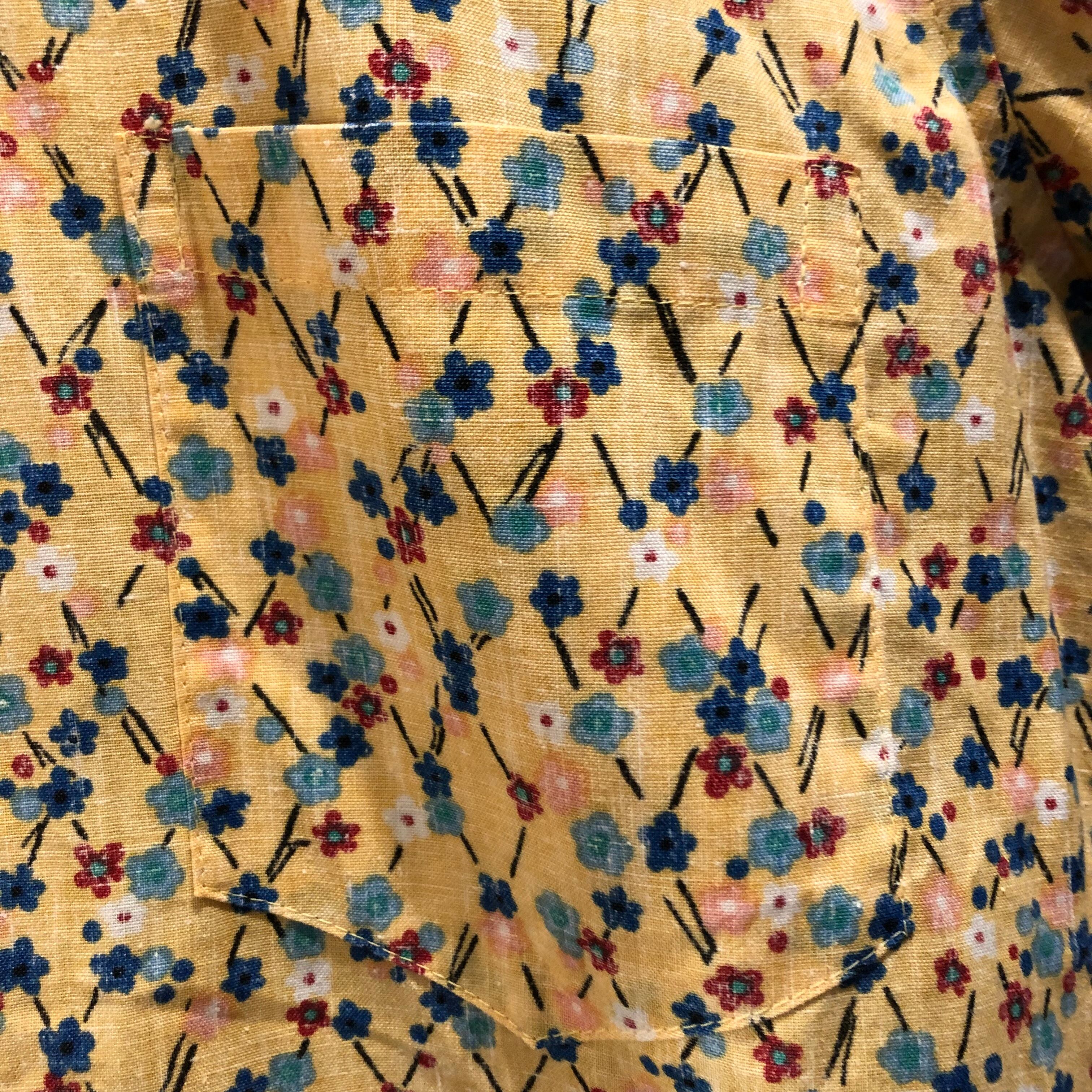 素材は、コットン60% ポリエステル40%で、ボディーの黄色は、コーンスープのような淡い色味です。花柄も小さくて可愛い感じで、きれいめなお洒落な雰囲気のアロハシャツです。