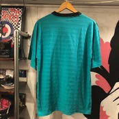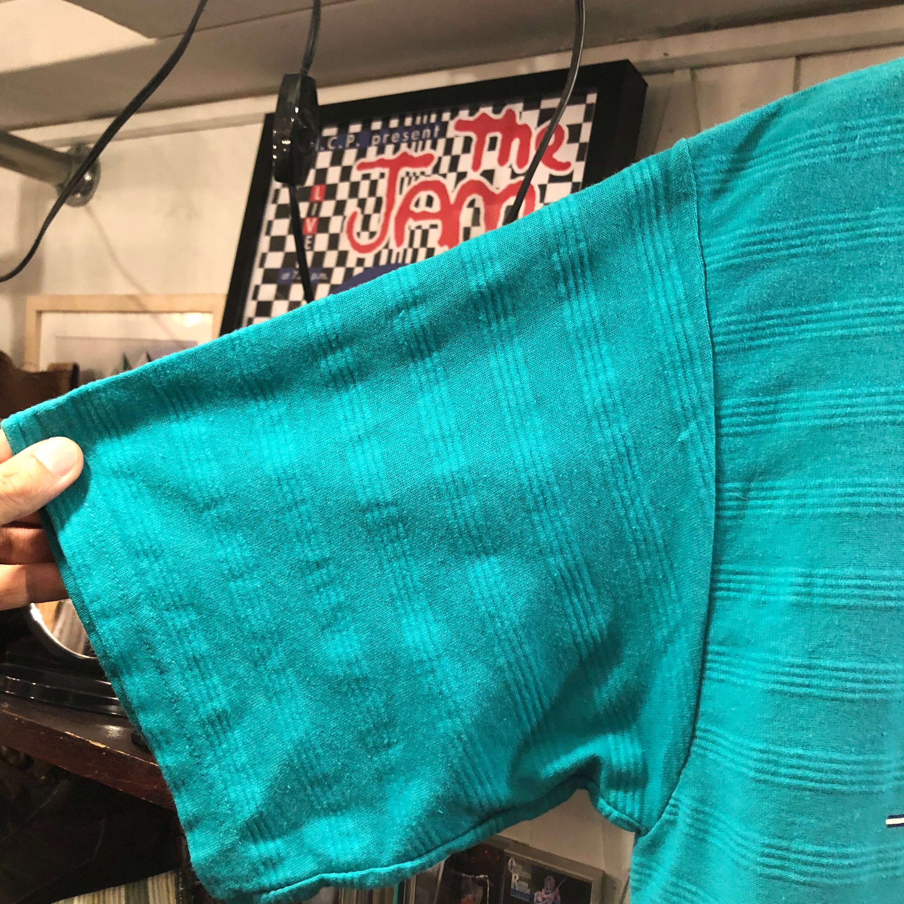 エメラルドグリーンが美しい凹凸のあるボーダー柄のTシャツです。