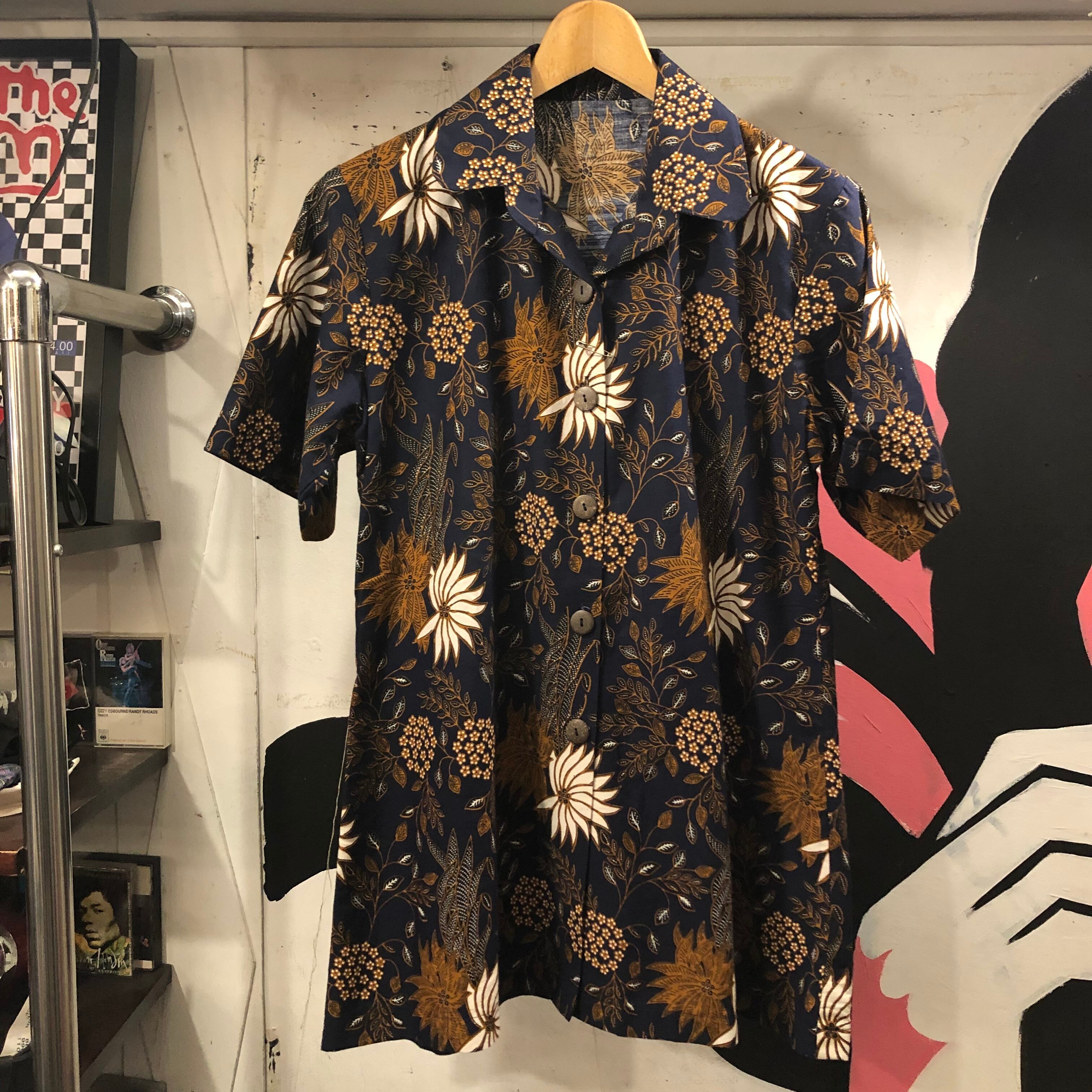 エキゾチックな花柄でシックなカラーリングのハンドメイドの開襟シャツです。レディースです。