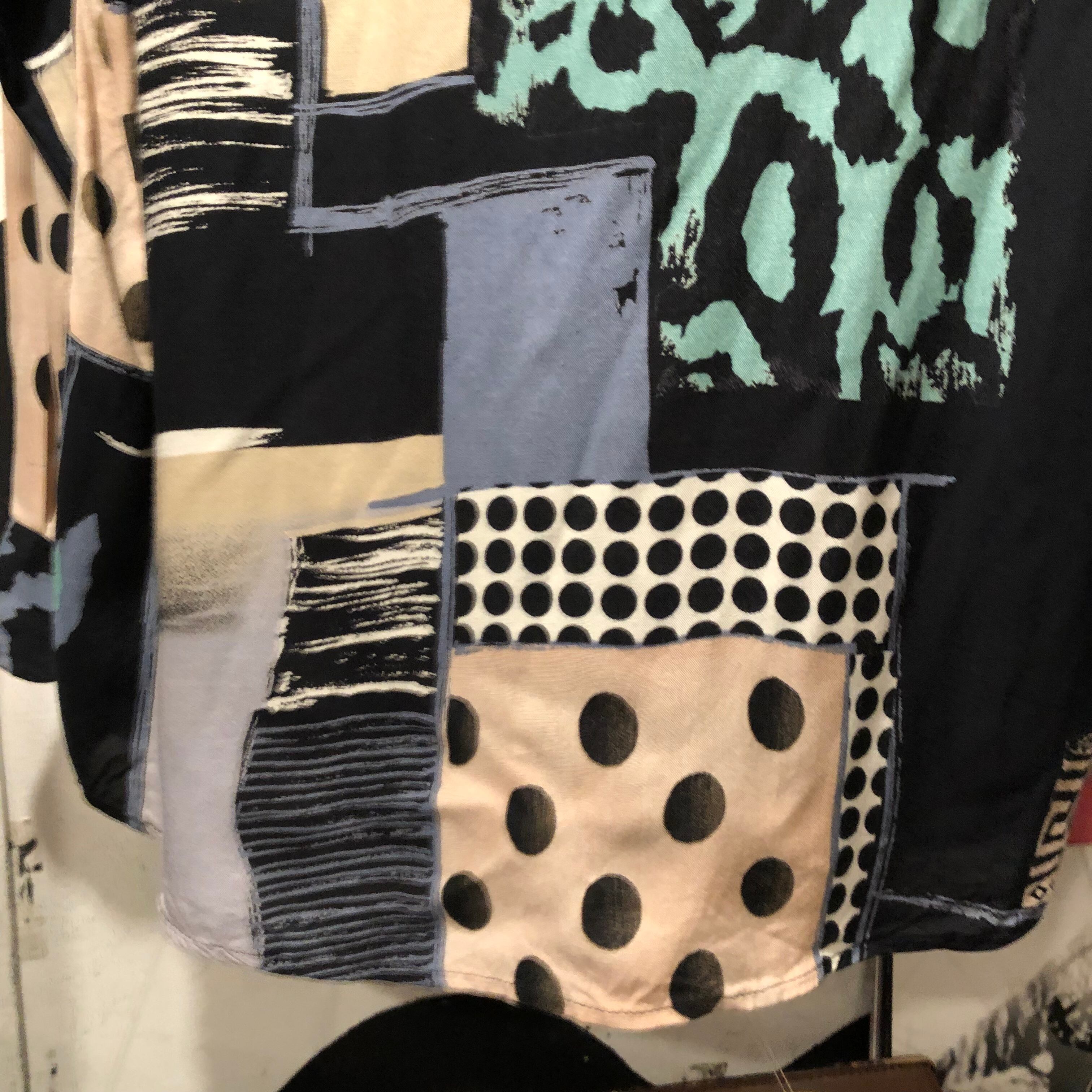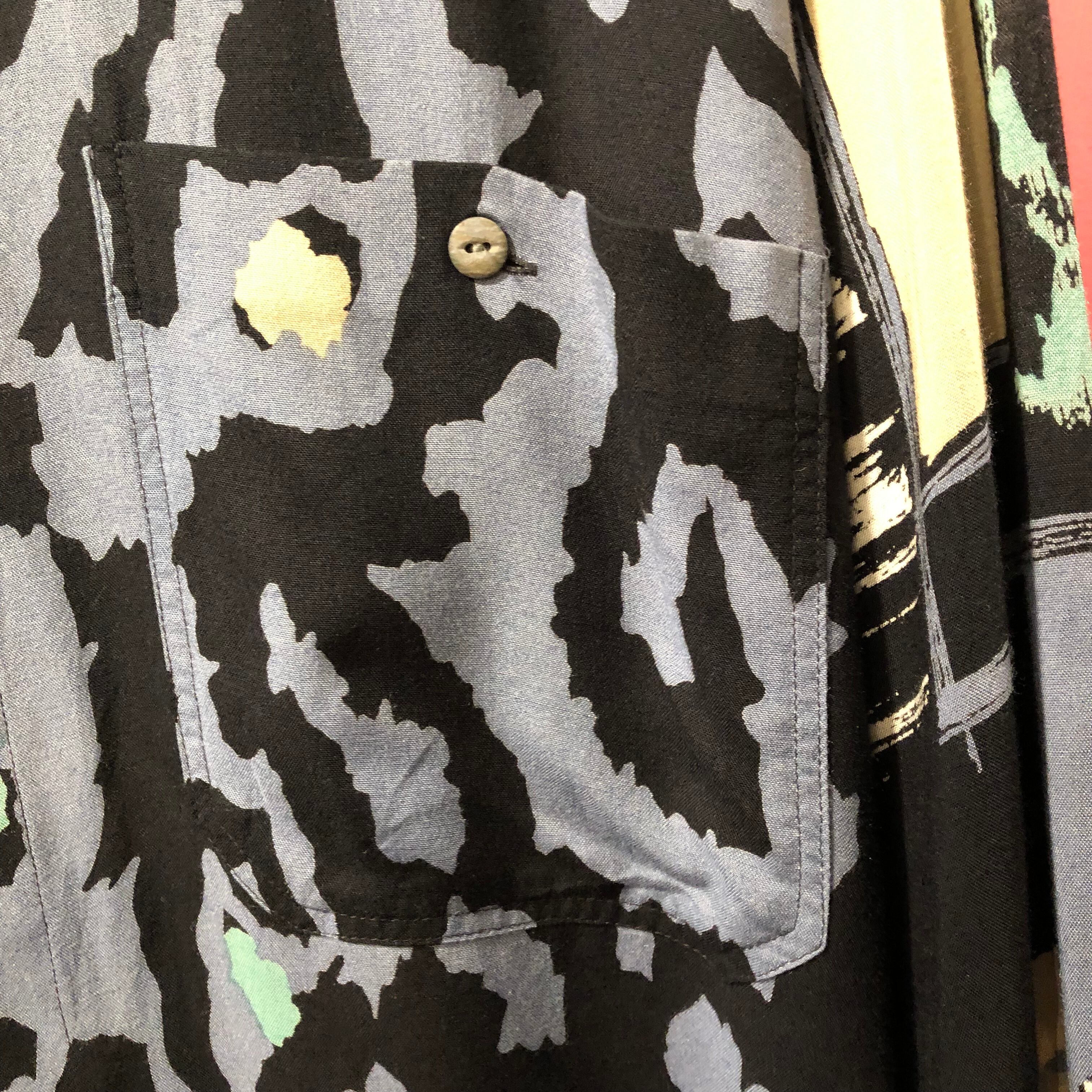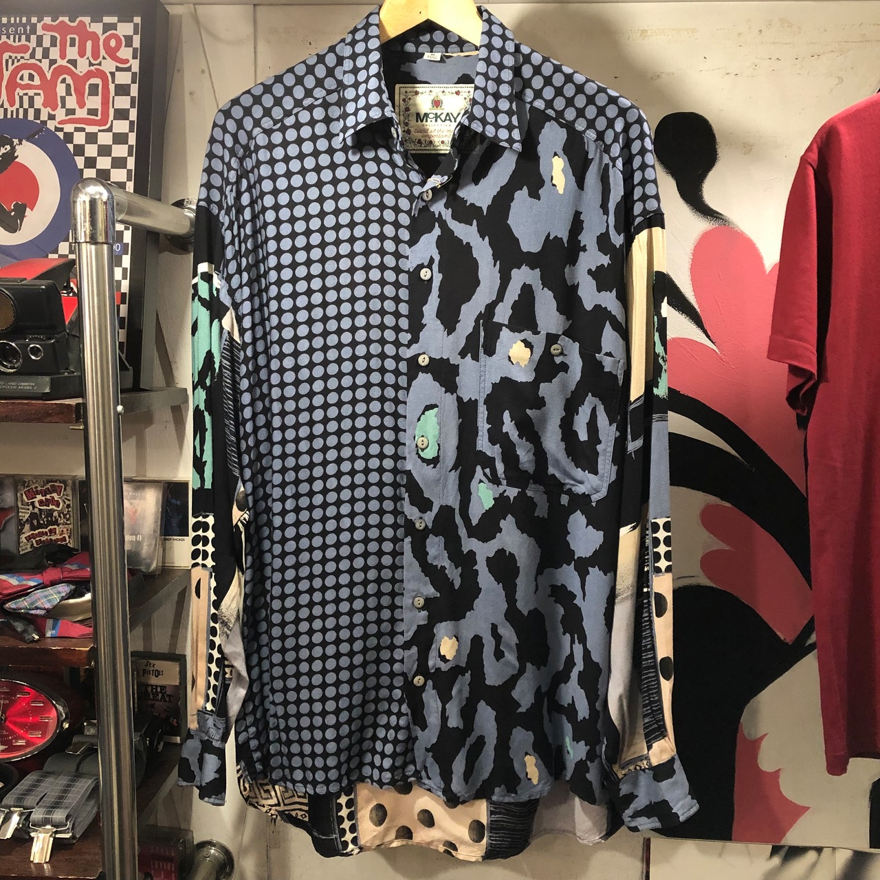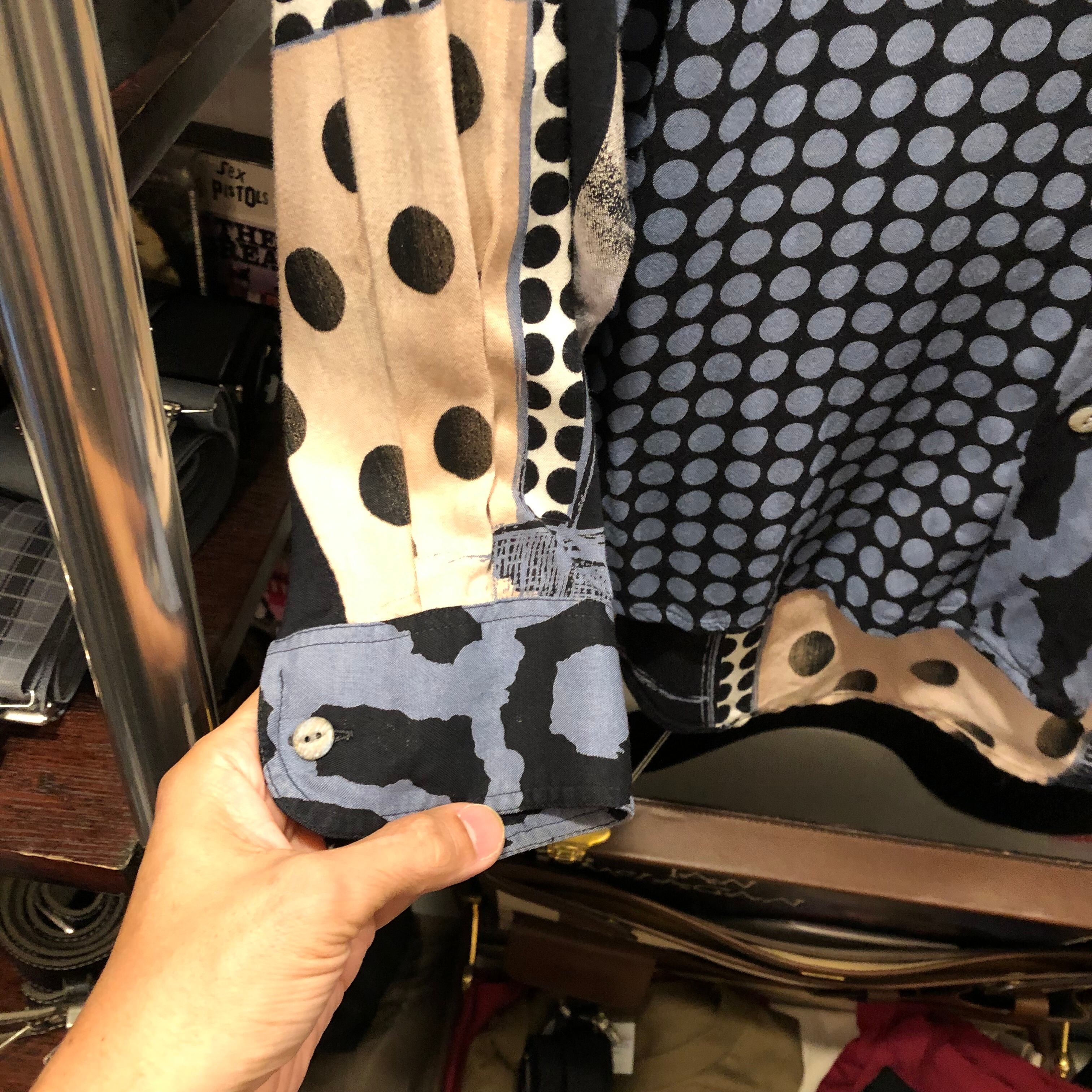 水玉ドット柄をメインに色々な模様が混じりあったユニークなデザインのシャツです。前身頃と後ろ見頃の柄も同一ではなくて、右半身と左半身も違う模様になっています。