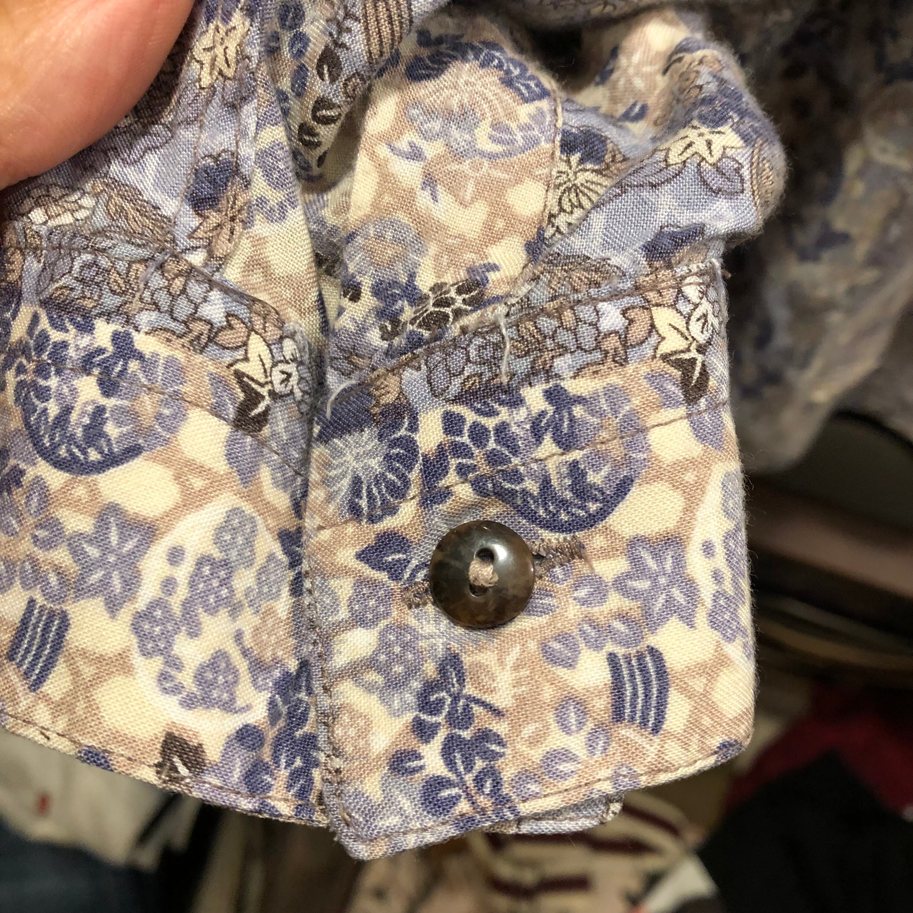 ブルーを基調にした爽やか色味の花柄シャツです。赤やオレンジ等の暖色系の花柄は、苦手な人には、特にお勧めです。ブルージーンズとの相性も抜群だと思います。